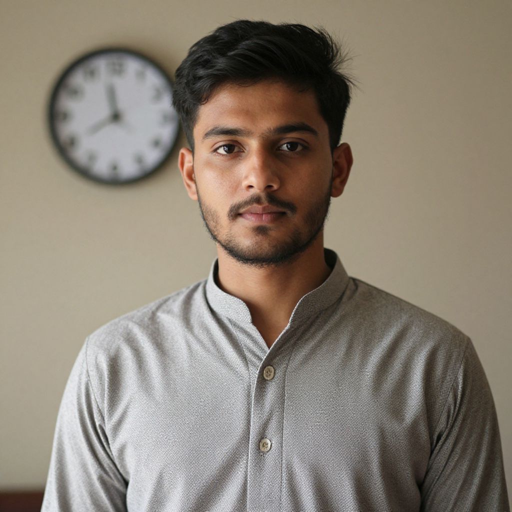 Photograph of a young Indian man with dark hair and beard, wearing a gray button-up shirt, standing against a beige wall with a clock in the