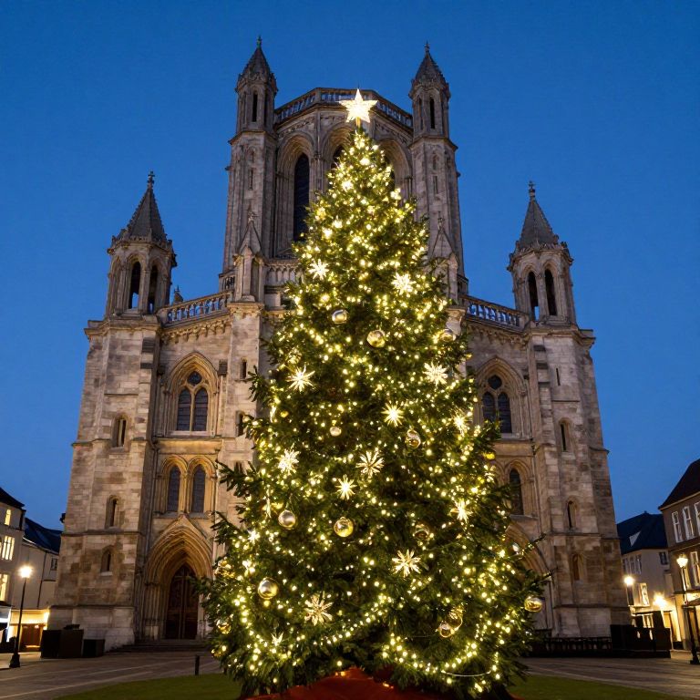 Photograph of a grand Gothic-style cathedral at dusk, illuminated by warm yellow Christmas lights. A large, decorated Christmas tree with glowing white star-shaped lights stands in front of the cathedral's ornate facade, featuring tall, pointed arches and twin towers. The sky is a deep blue, contrasting with the illuminated stone of the cathedral and the bright tree lights. Flanking the cathedral are two smaller buildings with traditional European architecture. The scene is serene, with the tree and lights drawing attention in the foreground.