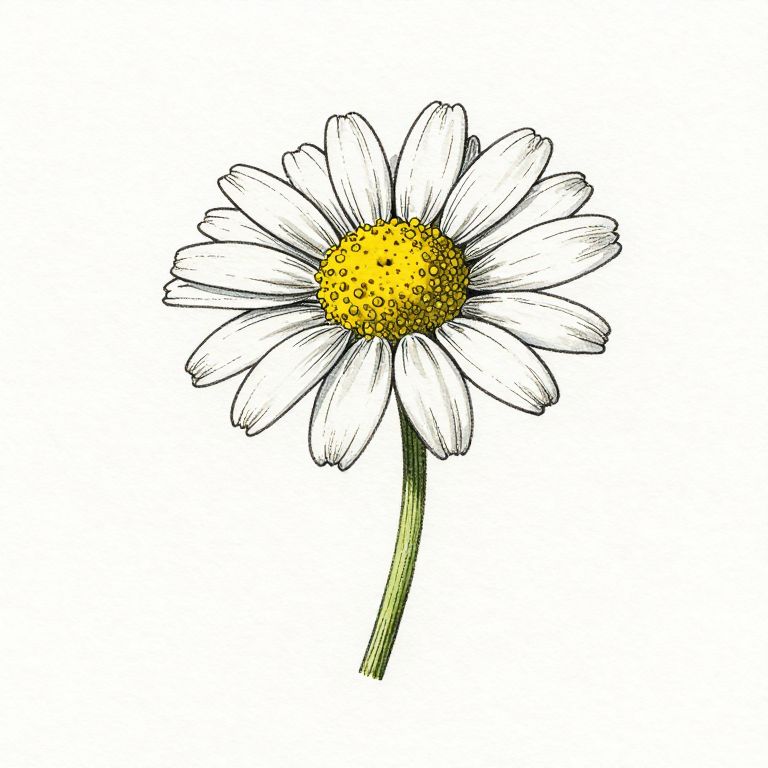 A detailed botanical illustration of a chamomile flower on a minimalist, screenprint background.