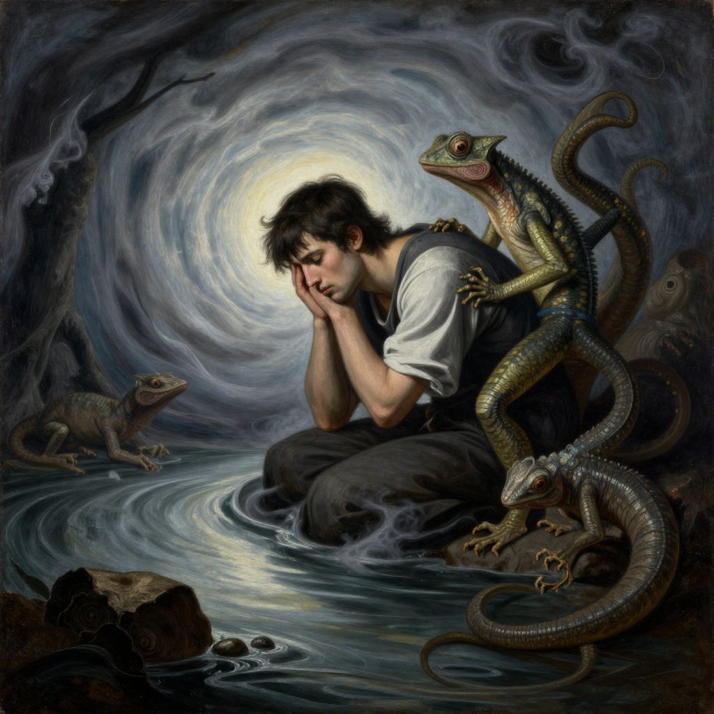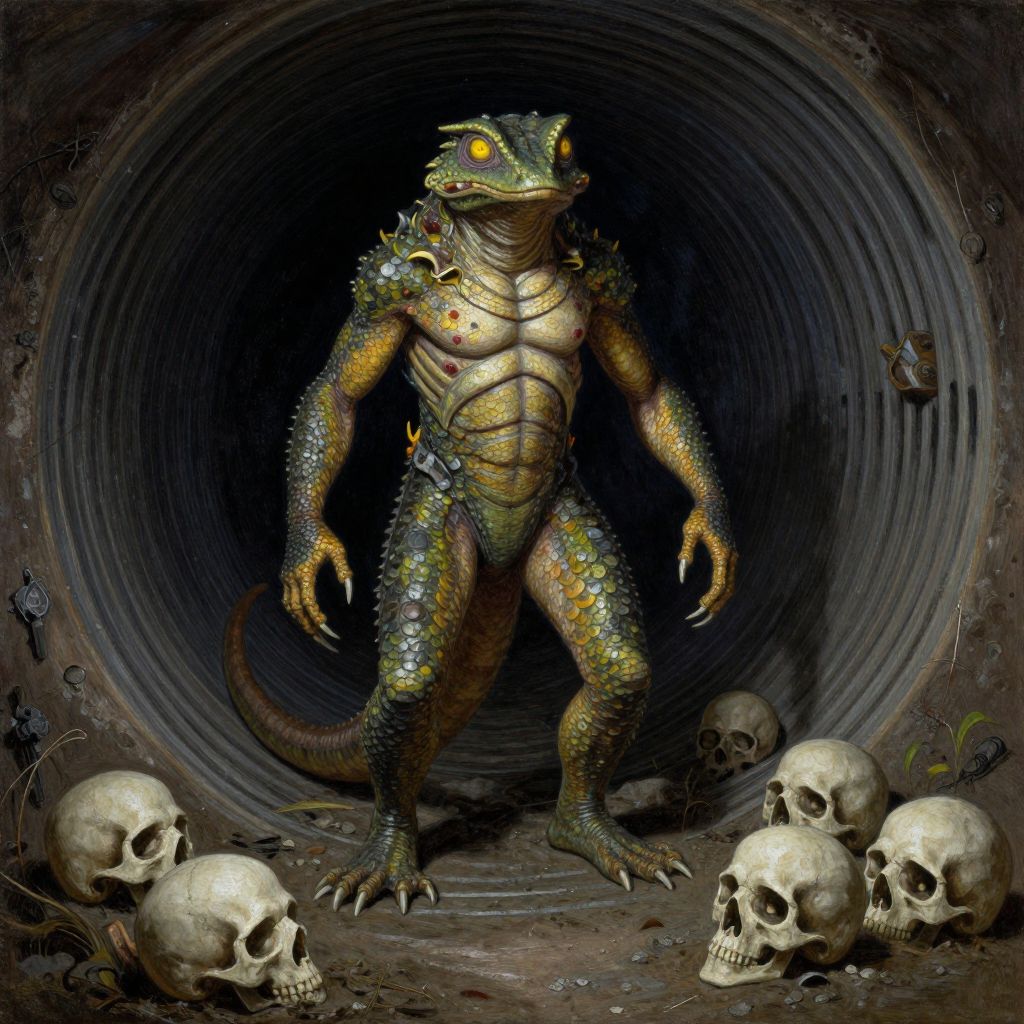 Digital artwork of a muscular, anthropomorphic lizard with yellow-green scales, standing in a dark, circular tunnel. Surrounding it are five skulls and scattered