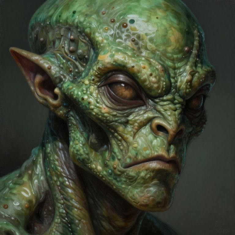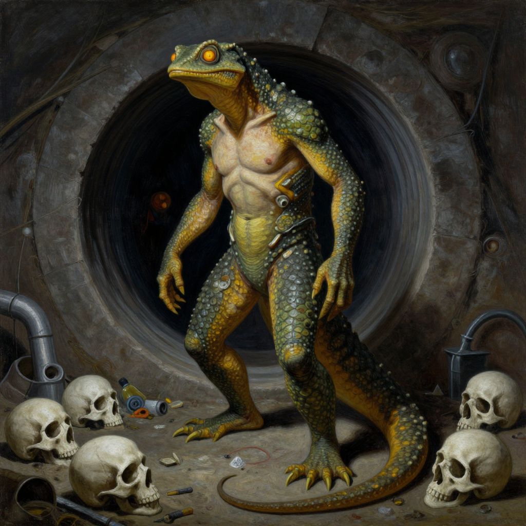 A painting of a half lizard half man creature standing in a sewer, russian lab experiment, human skulls on ground, glowing eyes, creepy, horror vibe, real, in the style of greg hildebrandt