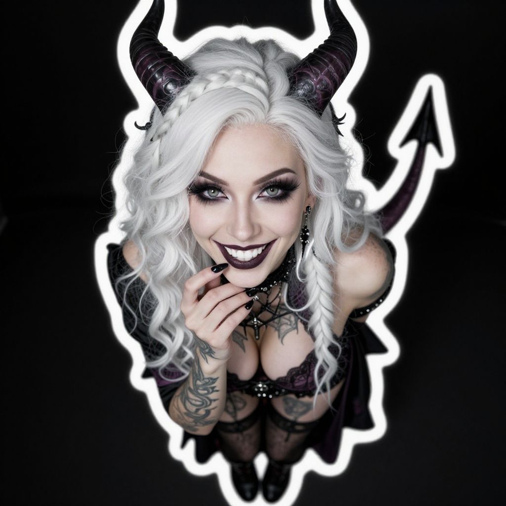 ((masterpiece, best quality, highres, realistic)) Perfect Face, score_9, score_8_up, score_7_up, masterpiece, highly detailed, shading, Goth woman, perfect face, beautiful eyes, perfect eyes, thick eye lashes, beautiful face, dark makeup, dark lipstick, happy, white skin, smiling, perfect white teeth, long curly white hair, side braid, long horns, long demon tail, medium breasts, ear piercings, curvy, wide hips, beautiful turtleneck dress, covered, thigh high lace stockings, long skirt, black boots, tattoos, hair accessories, deep black background, thick white outline surrounding just the character, POV from the ground up, character looking down at the viewer, touching her own lips with her right hand, view from the knees up