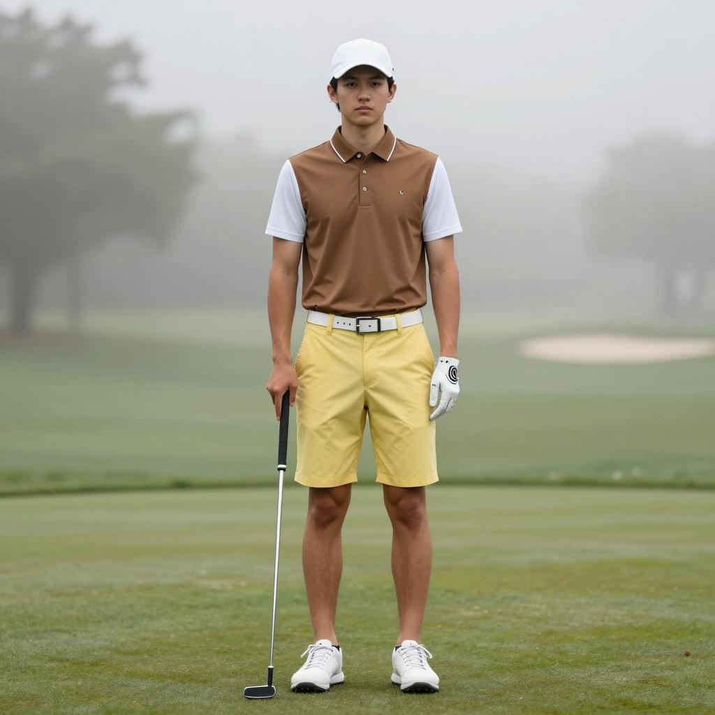 Golf attire costume, photograph of a young male golfer standing on a green putting green, full body shot, wearing a white cap, brown polo shirt, white short sleeves, yellow knee-length shorts, white belt, white sneakers, holding a putter in his right hand, misty foggy background, trees faintly visible, professional golf attire, calm expression, standing upright, daytime, studio lighting, realistic, casual pose, sporty, outdoors, athletic, clean cut, male, slight shadow under feet