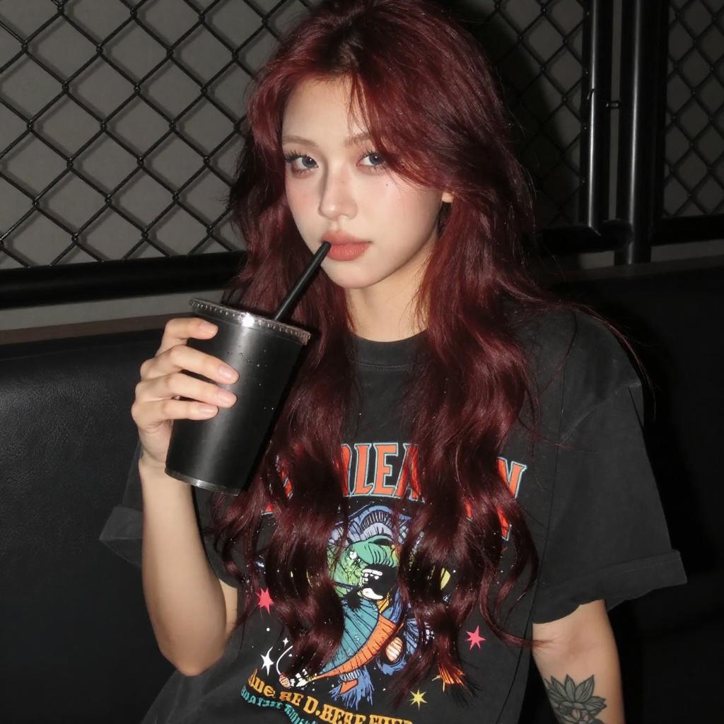 Photograph of an Asian woman with long, wavy, dark red hair, wearing a black graphic t-shirt with colorful and a black cup with a straw in her right hand. She has a tattoo on her left forearm and is sitting in a dimly lit room with a chain-link fence in the background.