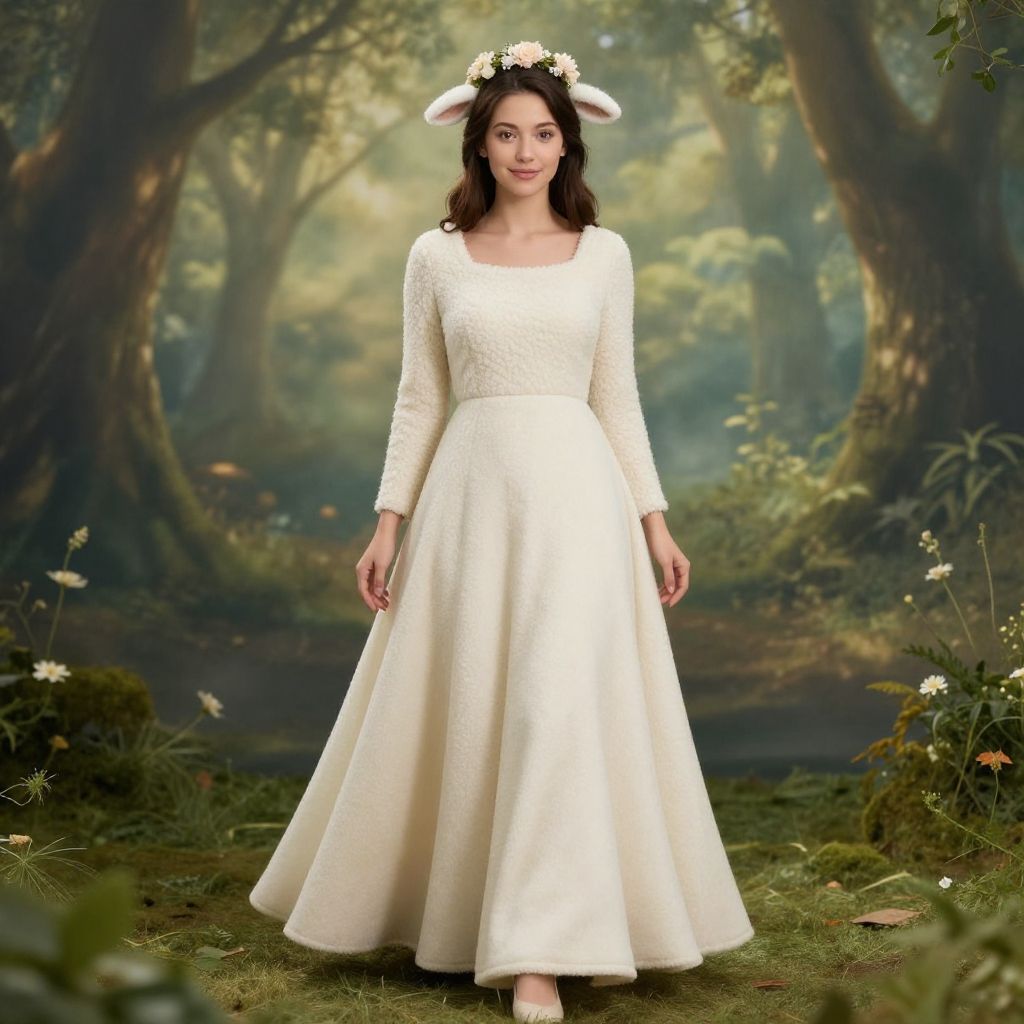 Elegant Mary had a little lamb costume adult style, combining soft lamb wool textures with graceful, flowing garments, delicate floral crown accessory, set against a dreamy forest glade background with dappled sunlight and gentle mist