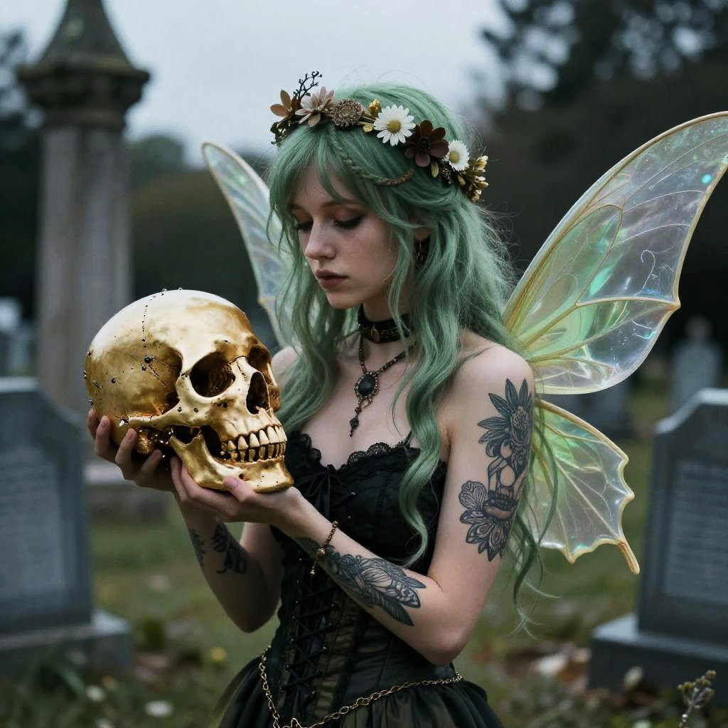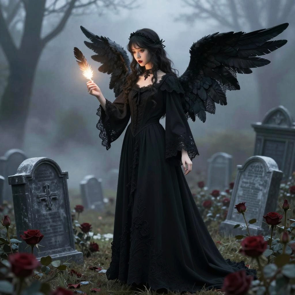 Realistic photo.a gothic angel, wearing a dark flowing robe with lace details, holding a glowing feather, standing in a misty graveyard filled with roses, illustrated in the gothic and elegant anime style of Kaori Yuki. realistic photo