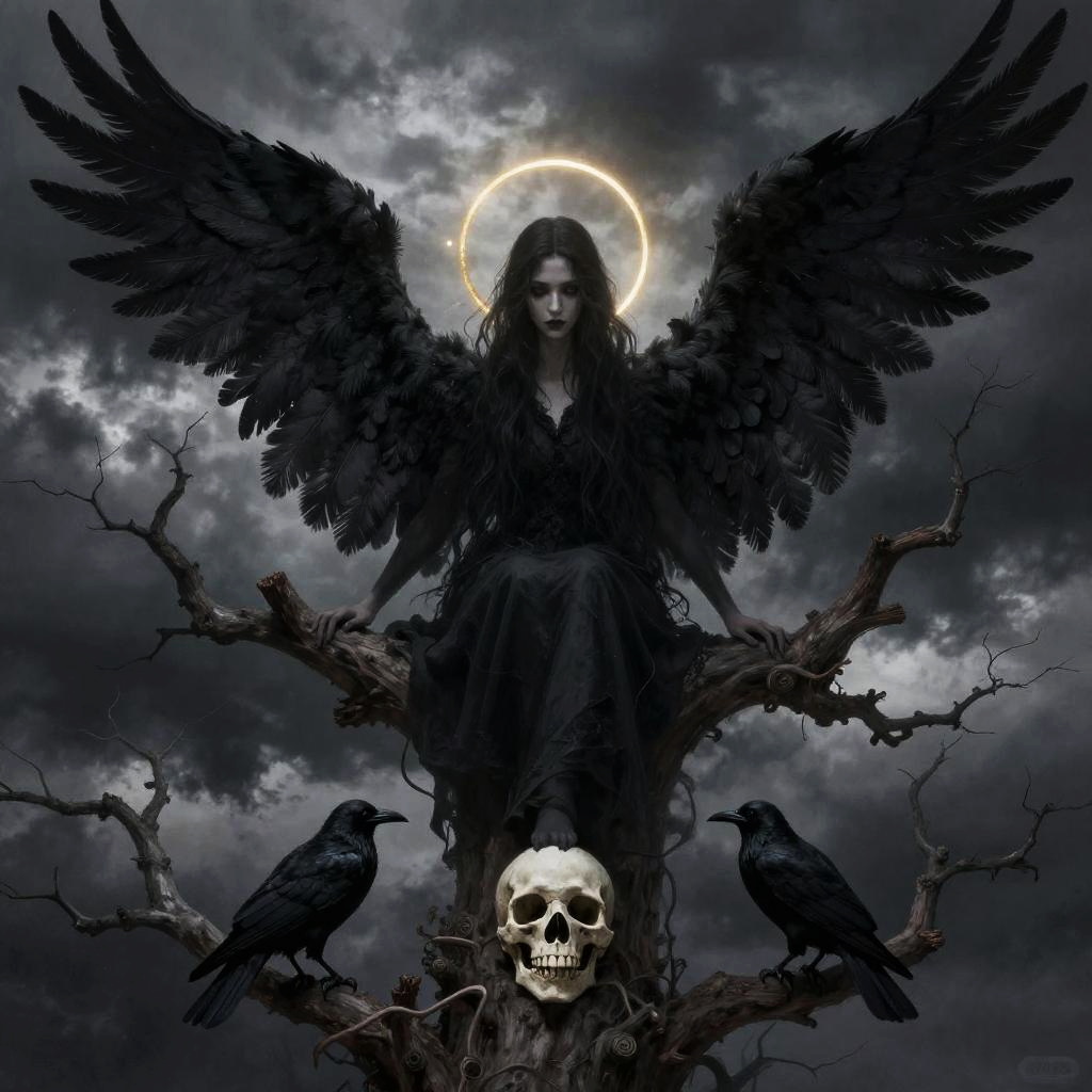 Digital artwork of a Gothic angel with black wings, wearing a long black dress, holding a glowing light in a misty cemetery with tombstones and red
