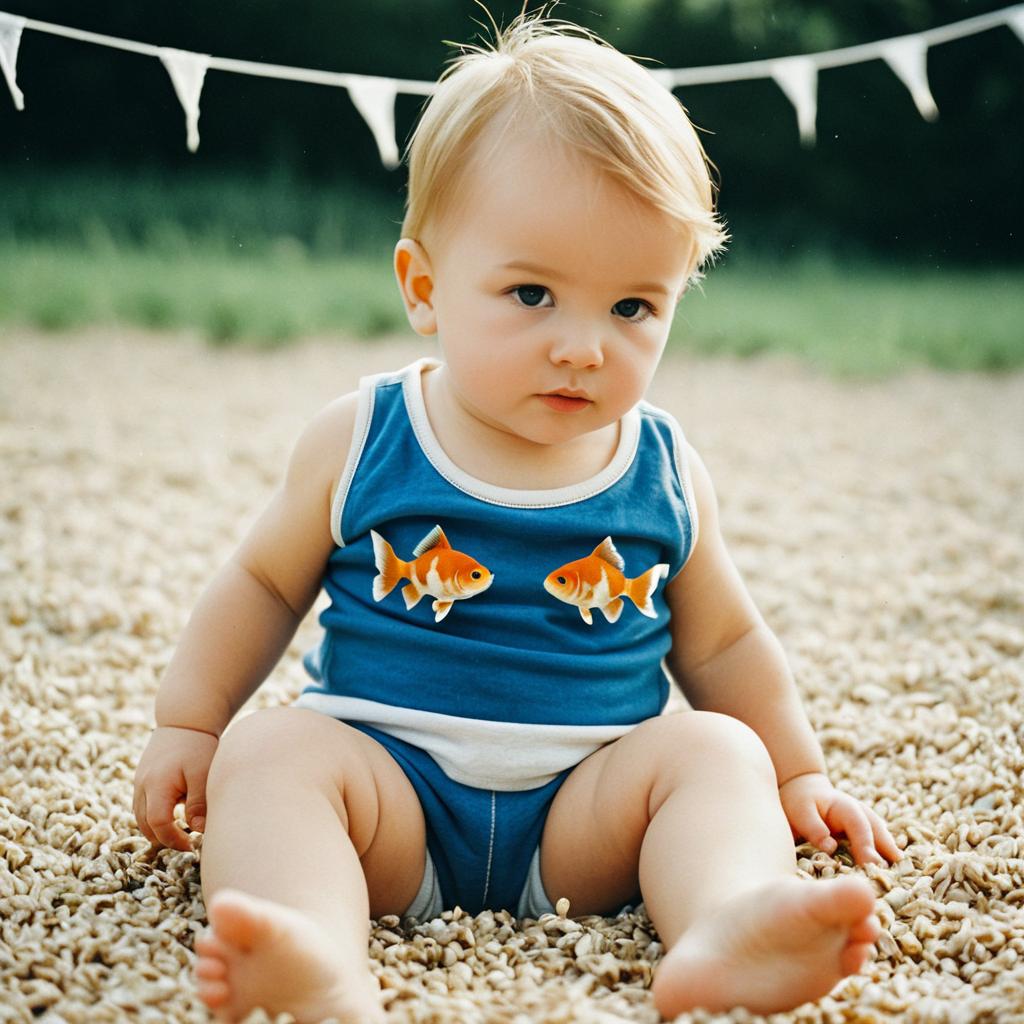 Soft goldfish bunting infant,male focus, 1boy, fish, solo, barefoot, goldfish, sitting, shorts, child, what, realistic