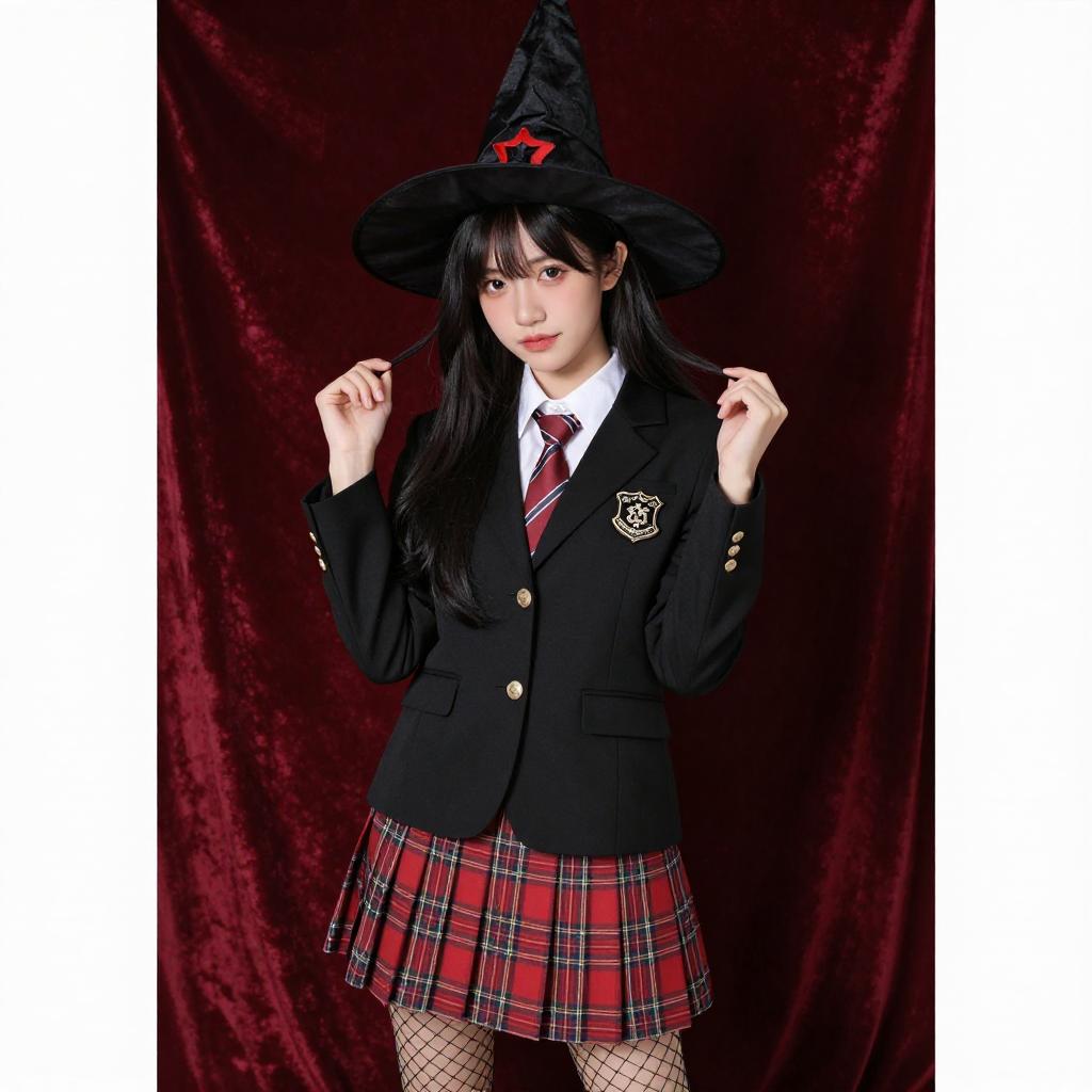 Photograph of a young woman with fair skin and long black hair, wearing a black witch hat with a red emblem, a black blazer with a school crest, a white shirt, red and yellow plaid skirt, and fishnet stockings. She stands against a dark red velvet backdrop, holding the edges of her blazer, with a confident, slightly playful expression.