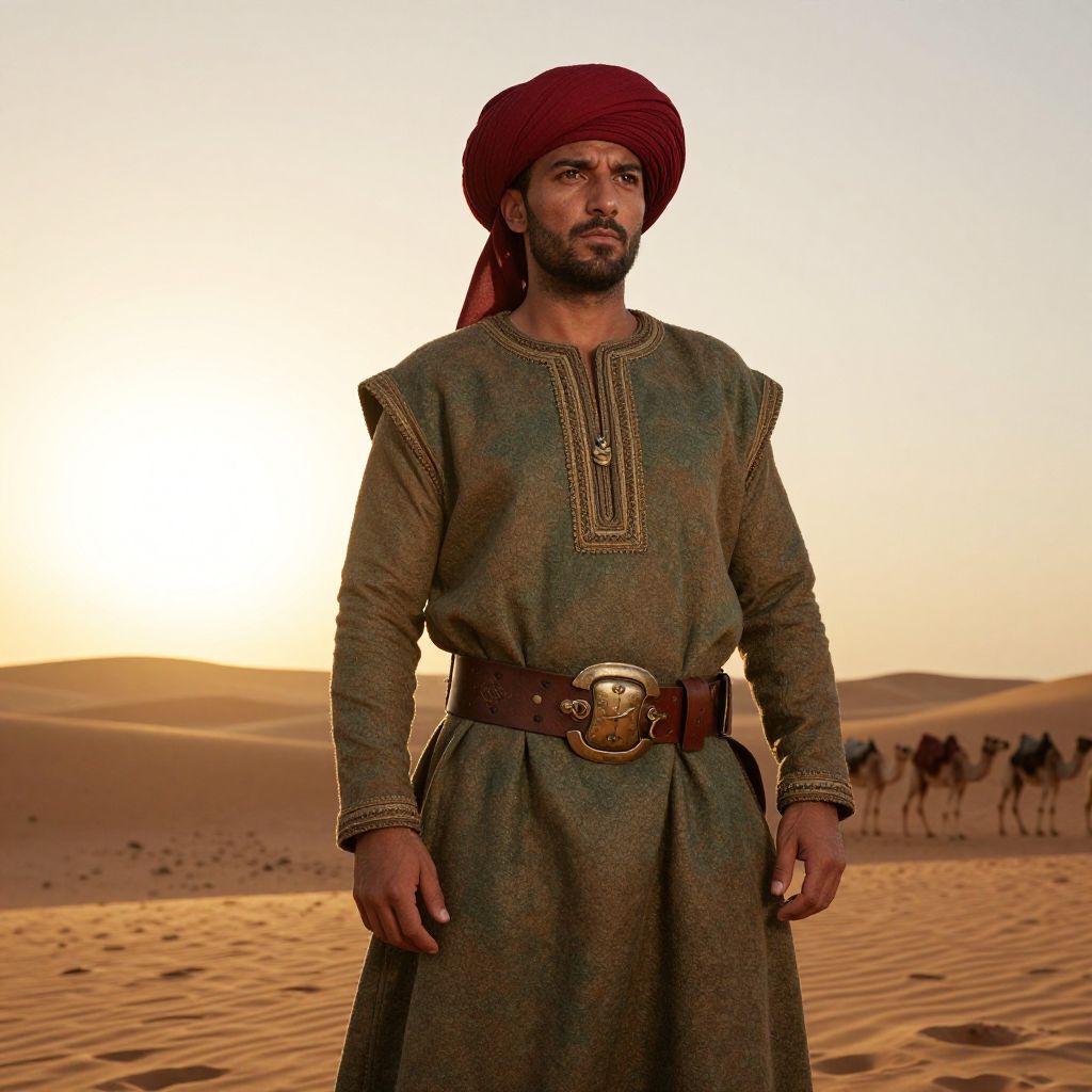 Photorealistic digital image of a bearded Middle Eastern man in a red turban, green tunic, and brown belt, standing in a desert