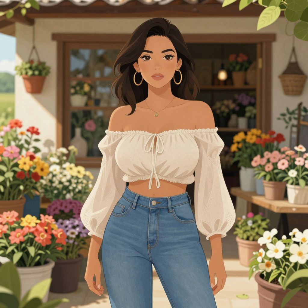A svelte woman in a boho chic off-shoulder beige top and high-waisted blue jeans, standing in a vibrant flower shop in a rural countryside, illustrated in the visual style of JC Staff. Sexy. Pretty face and beutiful eyes Sexy. Pretty face and beаutiful eyes. Big breasts