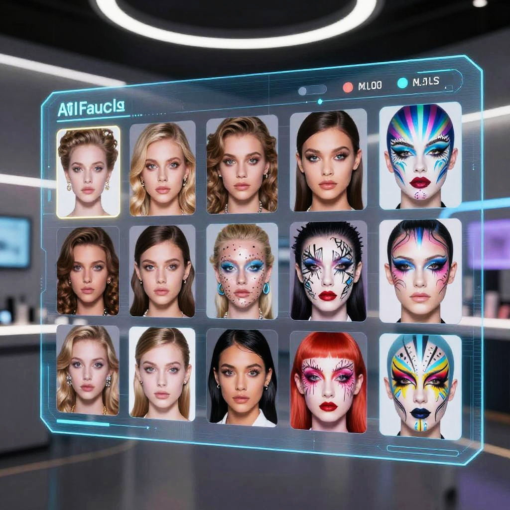An AI makeup generator interface displayed as a holographic control panel, generating a spectrum of makeup styles including elegant classic looks and bold, experimental art makeup, with detailed facial features and vibrant color gradients, set within a high-tech beauty innovation hub.
