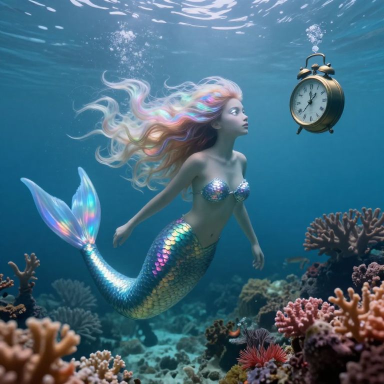 Photorealistic underwater scene: mermaid with iridescent scales and flowing blonde hair, wearing a shiny silver top, swimming beside a floating antique alarm