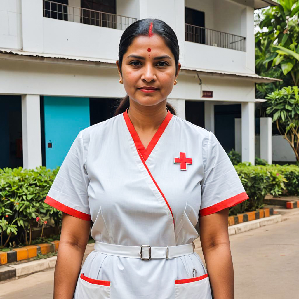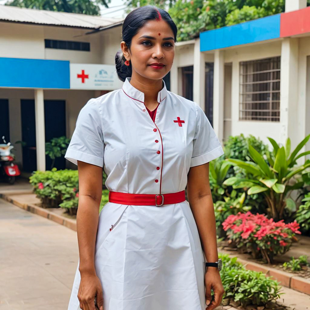 Photo of a Pear-Shaped woman, Sleek Ponytail, nurse outfit, white dress with Coral accents, Cotton fabric, blue apron with Maroon red cross emblem, sarees, neighborhood clinic, retro vibe