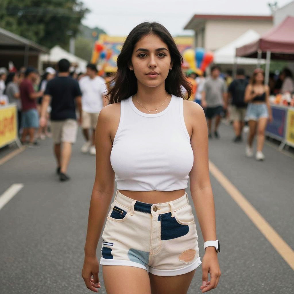 A slim woman, in a chic black sleeveless top and floral print shorts, captured in the visual style of a disposable camera, enjoying an evening walk in the village square. Sexy. Pretty face and beаutiful eyes. Big breasts
