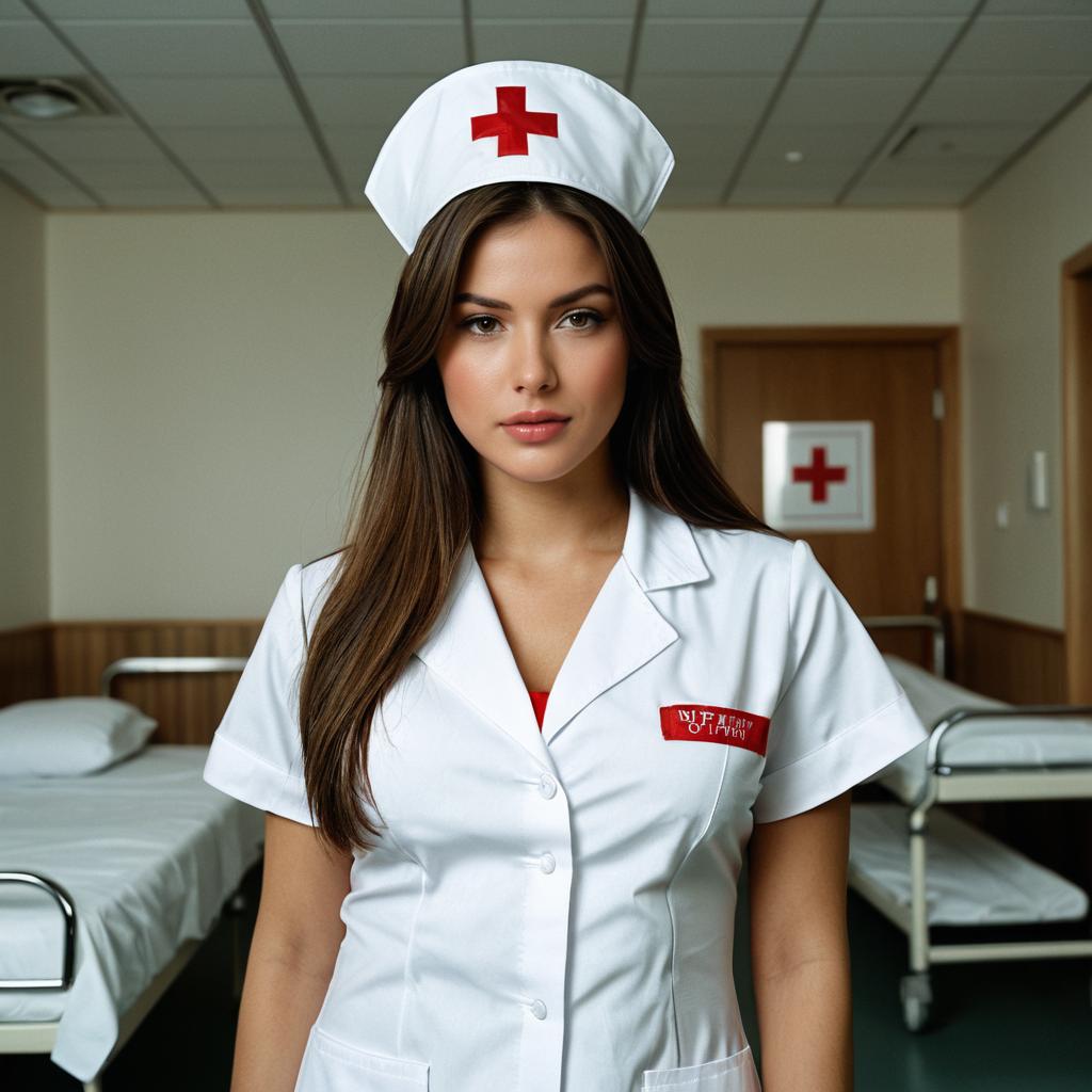 Sluty nurse outfit,1girl, nurse, solo, hat, realistic, nurse cap, brown hair, brown eyes, photorealistic, long hair, looking at viewer, indoors, standing, lips