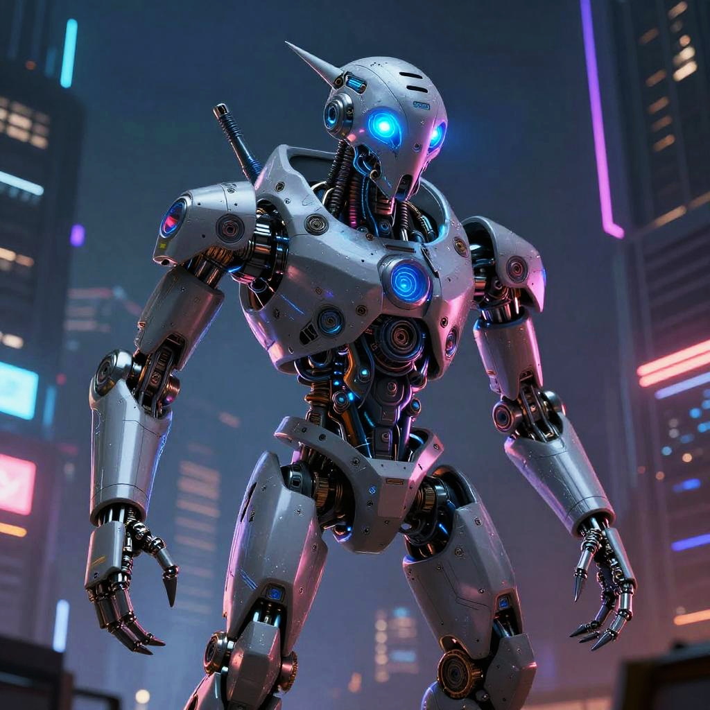 CGI image of a futuristic, silver robotic humanoid with glowing blue and pink lights, standing in a neon-lit cityscape at night.