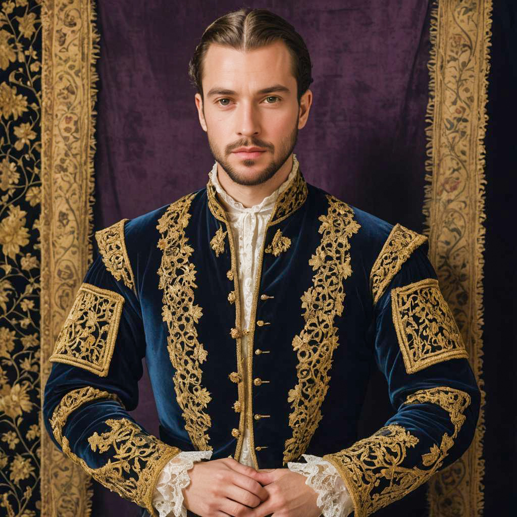 Man in Tudor Period Velvet Doublet with Gold Embroidery