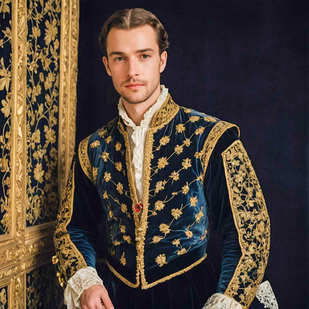 Portrait of a lean man dressed in a Tudor period outfit, featuring a deep blue velvet doublet adorned with intricate gold embroidery and a white silk chemise with lace cuffs. The subject has side-swept hair and stands against a dark background beside an ornate panel with matching gold floral embroidery.