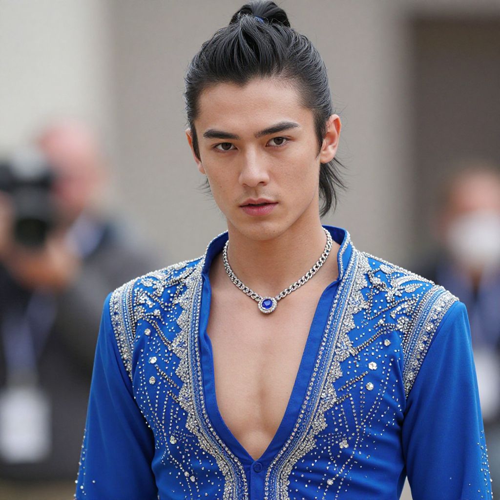 Photograph of an Asian man with short, black, slightly messy hair, standing outdoors in a grassy field. He has a lean, muscular build and a serious expression. He is wearing a black tank top with large white polka dots, and a delicate silver necklace with a small heart pendant. The background is blurred, featuring green grass and trees, creating a natural, outdoor setting. The lighting is natural, highlighting his facial features and the texture of his clothing.