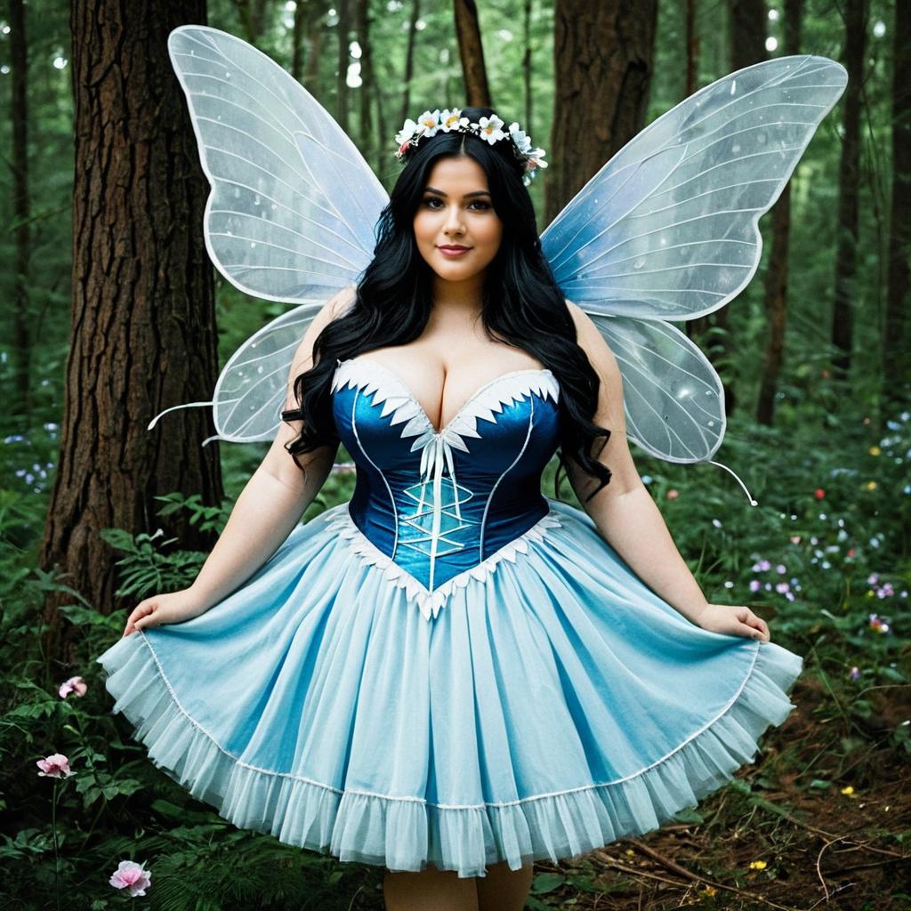 Portrait of a woman with long black hair standing outdoors in a forest during autumn. She is wearing a multicolored corset dress with a vibrant leaf pattern and black ruffles, surrounded by yellow and orange autumn leaves on the ground and trees. The woman is looking directly at the camera, showcasing the detailed design of her dress with a visually striking cleavage.