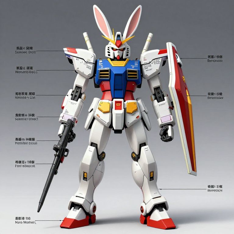 Precious a Mech with the form of a rabbit , naming all their parts with descriptions, detailed , Gundam style,