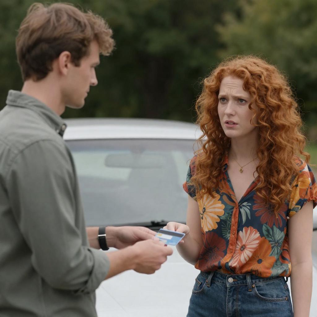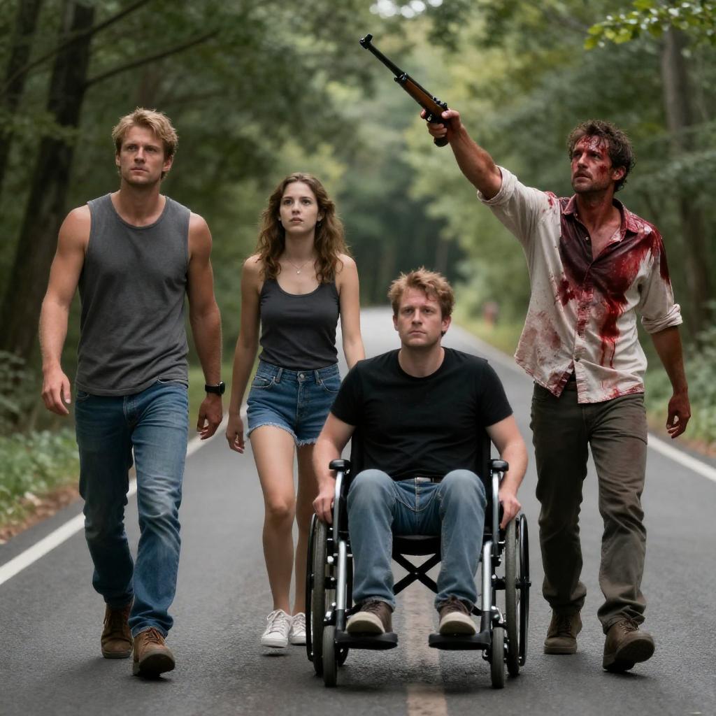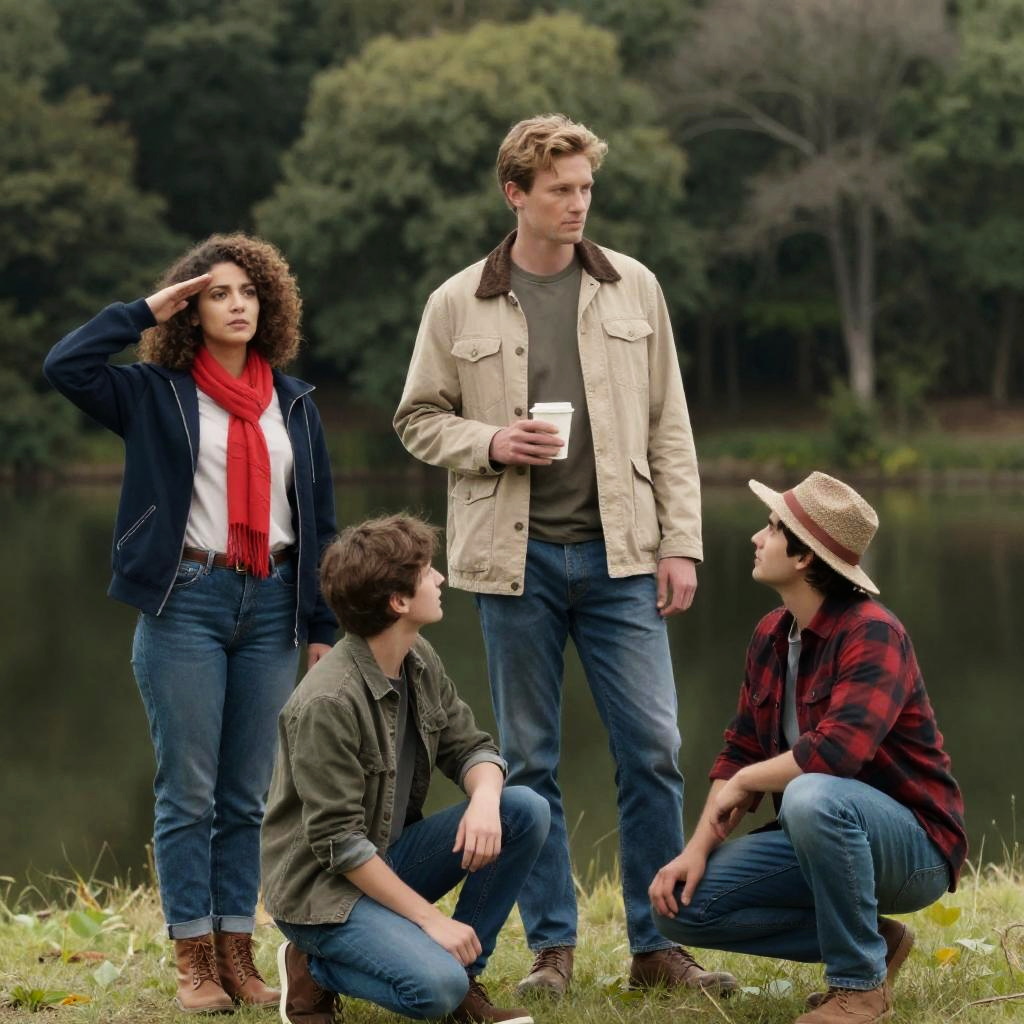 Five people pulling on a rope in a forest. Woman with curly red hair in yellow shirt, blue jeans. Man with brown hair in white shirt, black pants. Man with sunglasses in plaid shirt, dark pants. Woman with blonde hair in sleeveless top, jeans. Man in red plaid shirt, beige pants. Rocky ground, dense trees, clear sky with clouds. All leaning forward, intense expressions.