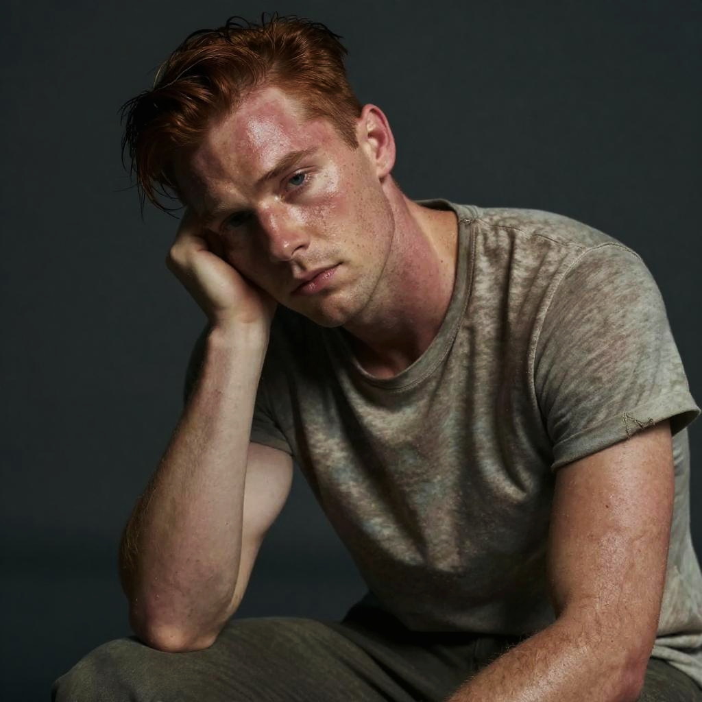 ((full-body shot)), ((hero shot)), a photo of a seductive man with loose styled (red slick undercut hair:1.1), (oiled shiny skin:0.6), bored, he is wearing an (old t-shirt:1.1) and cropped pants, highly detailed skin, skin blemish (textured skin, skin pores:1.2), (moles:0.8), (imperfect skin:1.1), intricate details, goosebumps, flawless face, (light freckles:0.3), ((photorealistic):1.1), (raw, 8k:1.2), dark, muted colors, slate atmosphere, RAW candid cinema, 16mm, color graded portra 400 film, remarkable color, ultra realistic, textured skin, remarkable detailed pupils, realistic dull skin noise, visible skin detail, skin fuzz, dry skin, shot with cinematic camera, detailed skin texture, (blush:0.5), (goosebumps:0.5)