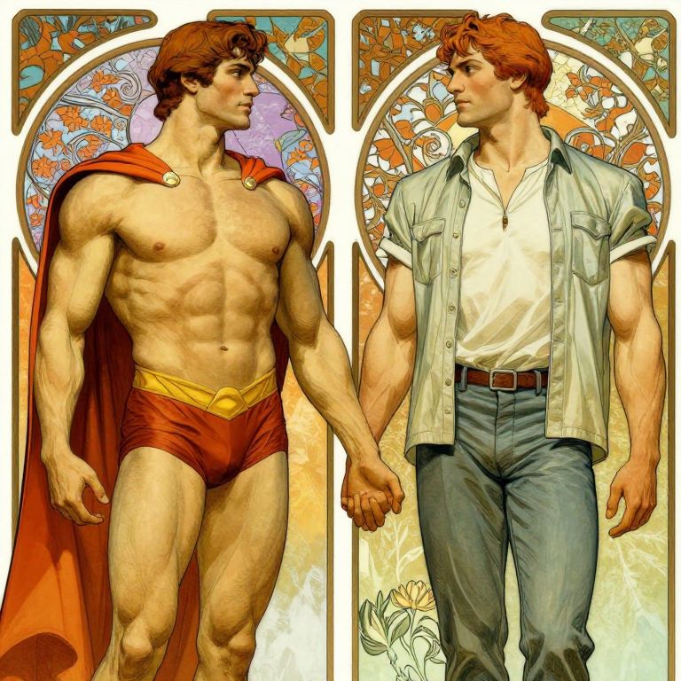 Two muscular male superheroes in Art Nouveau style, holding hands, with one wearing a cape and the other in casual attire.