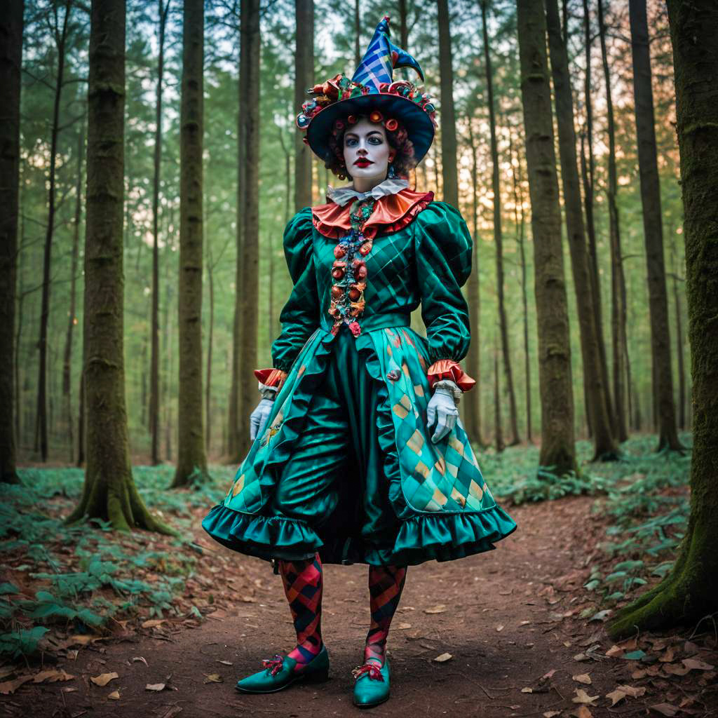Person in Vibrant Harlequin Jester Costume in Twilight Forest