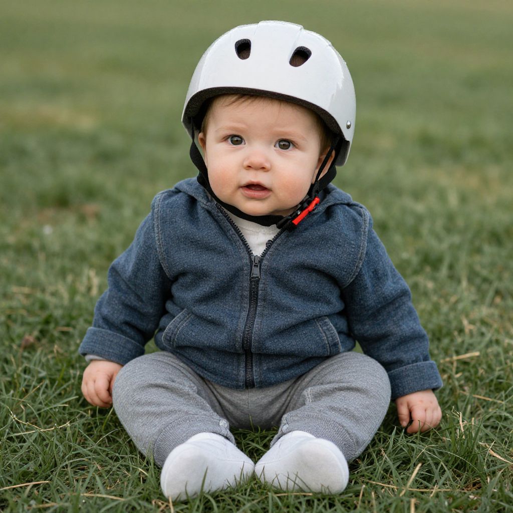Photograph of a cute, fair-skinned baby with dark hair, wearing a white helmet, blue jacket, gray pants, and white socks, sitting