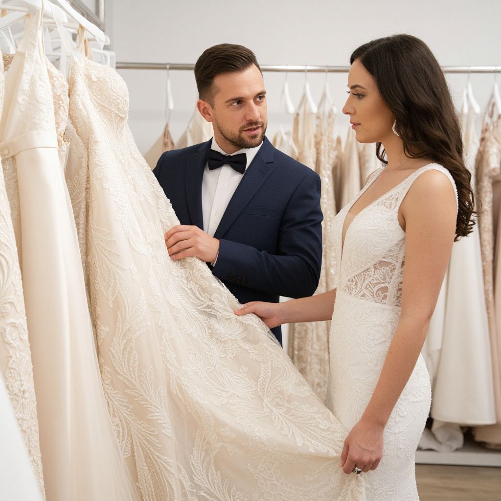 A well-dressed man in a dark suit and bow tie assists a young woman in a white lace dress as they examine an expensive embroidered wedding gown in a bridal shop. The woman has long dark hair and wears statement earrings, standing beside a rack of elegant wedding dresses.