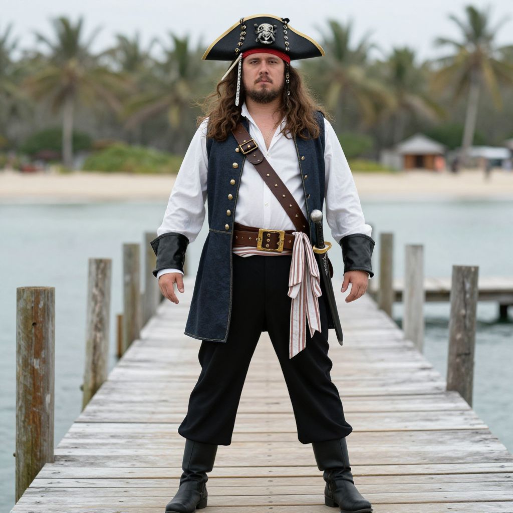Photograph of a muscular man with long brown hair and a beard, dressed as a pirate. He wears a black tricorn hat with a silver emblem, a white shirt, black vest, and black pants. He has a brown leather belt with a large gold buckle and a brown sash with white fringes. His black boots are slightly worn. He stands confidently on a wooden pier with the ocean and blurred palm trees in the background. The sky is overcast. His expression is serious, and he has a slightly open stance, with hands by his sides.