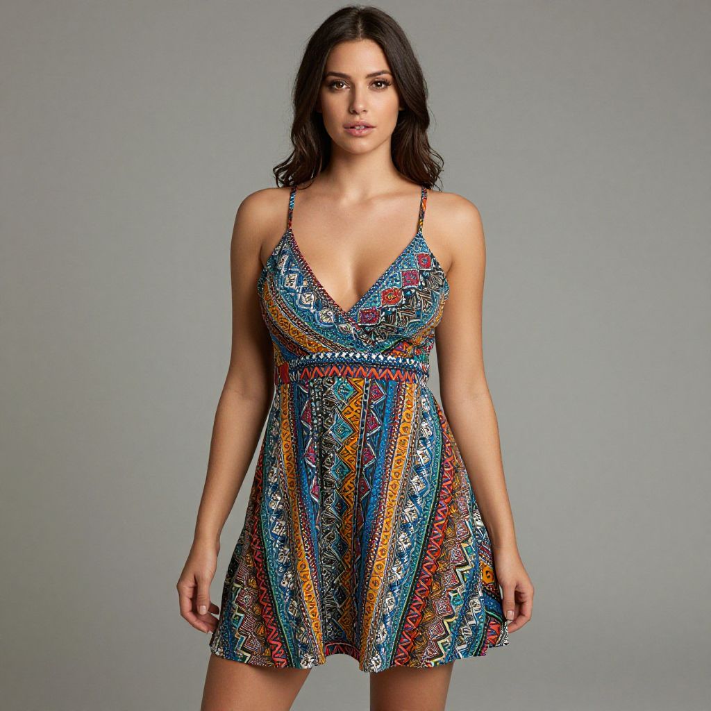 "Woman, summer clothing, sleeveless mini dress with a mix of vibrant colors, geometric and tribal-inspired patterns, thin straps, V-neckline, lightweight fabric, flared skirt.. Sexy. Pretty face and beаutiful eyes. Big breasts."