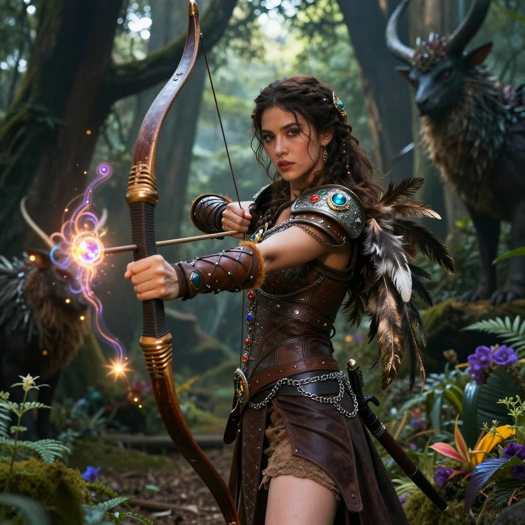 Female fantasy warrior in a dense enchanted forest, wearing leather and chainmail armor adorned with feathers and gemstones, holding a bow with magical glowing arrows, mythical creatures lurking in shadows, vibrant colors and magical ambiance