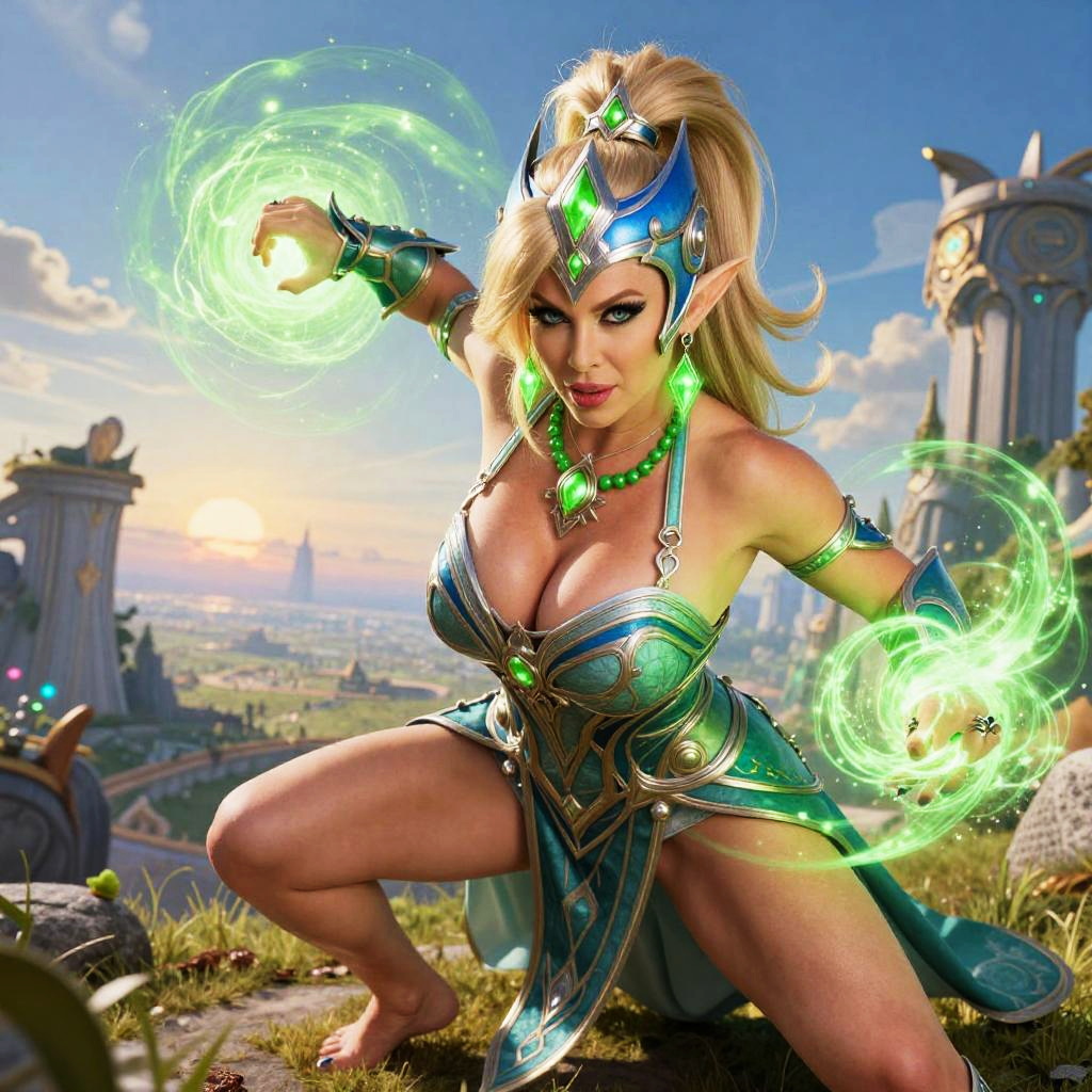 (masterpiece, best quality:1.4), colorful, vibrant image, sharp focus, highly detailed, intricate, ultra detailed textures, digital art, HDR, 8K, Alarielle is (in battle stance, dynamic pose:1.1), (green magic:1.2), green power, glowing eyes, sunrise chaos blue sky and fields complex fantasy background, confident look, (tricky glance:1.1), looking at viewer, (full body shot:1.25), blonde hair, ponytail, pointy ears, lipstick, makeup, detailed hair, detailed face, blue eyes, (ultra detailed realistic perfect eyes:1.1), perfect face, jewelry, (ultra blue helmet:1.25), headgear, (helmet covering temple hair:1.1), intricate dress, armor, bare shoulder, barefoot, mature female, milf, 40yo, curvy, (huge breasts:1.1), cleavage