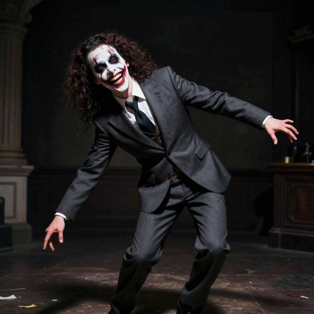 A photograph of a man with curly black hair, dressed in a dark gray pinstripe suit, white shirt, and black tie, standing on a dimly lit stage. His face is painted white with black eye makeup and red lipstick, resembling a clown or theatrical character. He is leaning forward with arms outstretched, creating a dynamic, almost sinister pose. The background is dark with faint architectural details, including a column and a piece of furniture, suggesting an old, grand hall. The lighting highlights his face and suit, casting shadows on the stage floor.