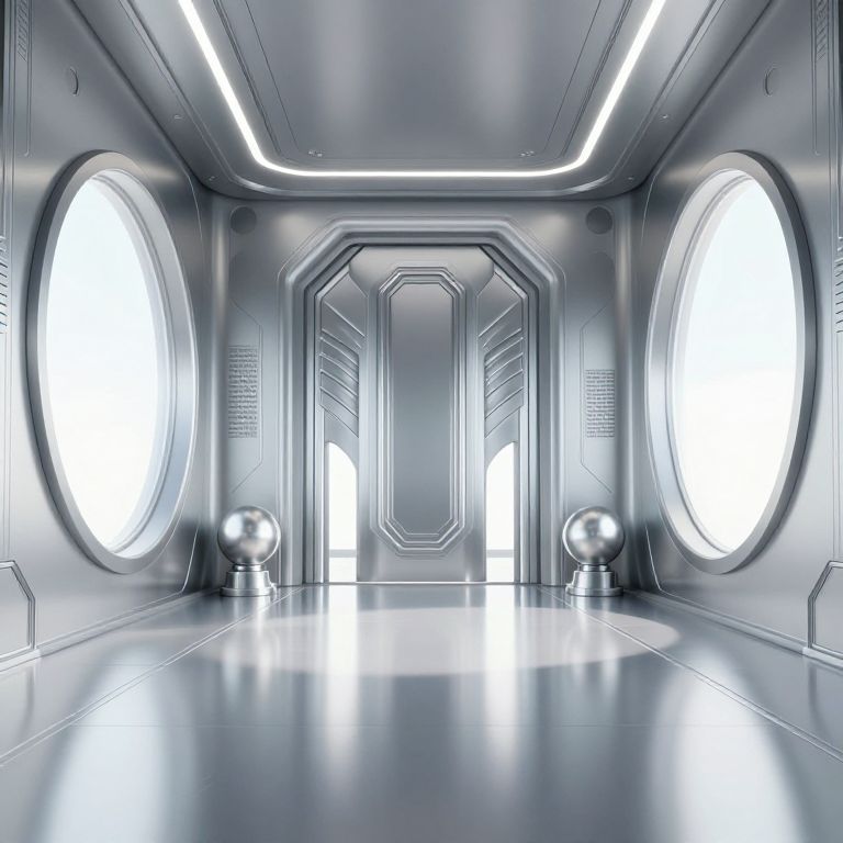 Photograph of a futuristic, sleek, metallic corridor with glowing white LED lights, smooth reflective floor, and minimalist design.