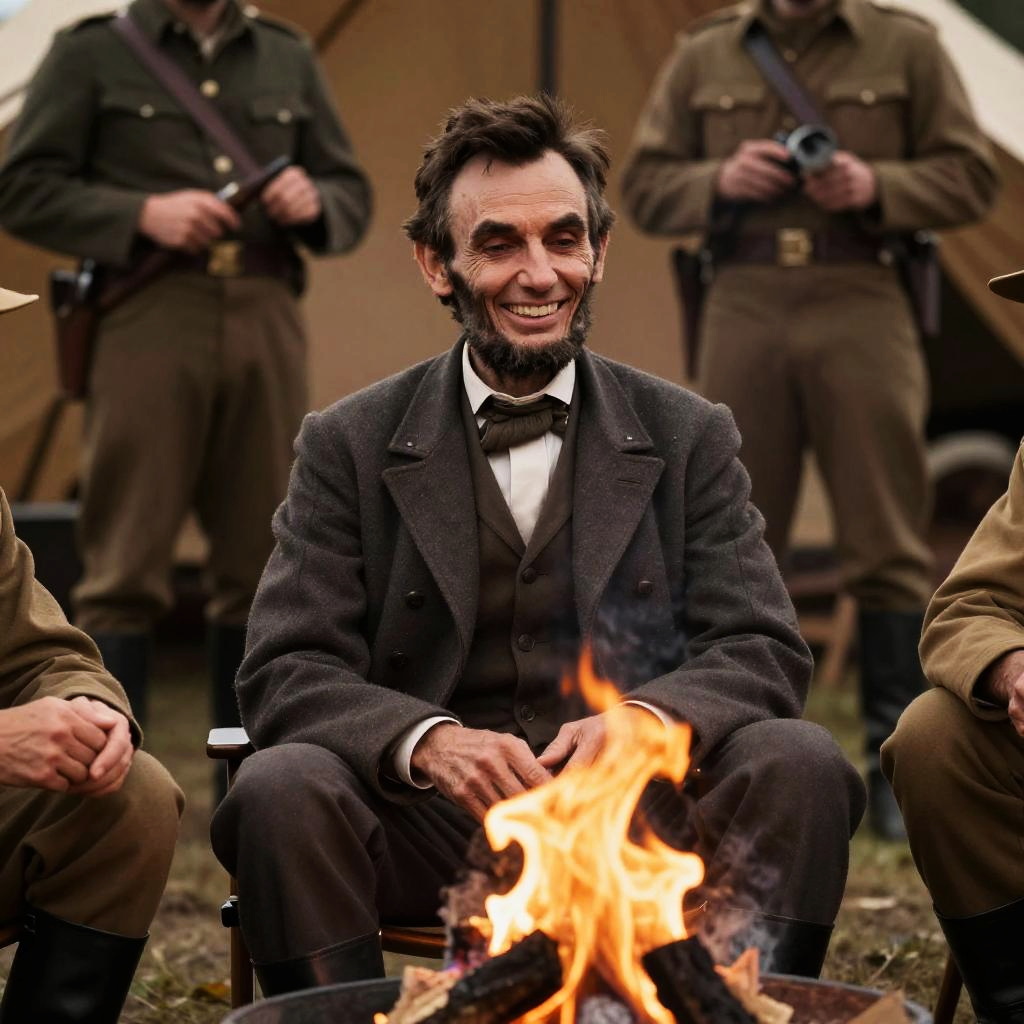Abraham Lincoln laughing candidly at a Civil War campfire, soft glow from flames illuminating his face, period-accurate soldier uniforms around, rich earthy tones and detailed background