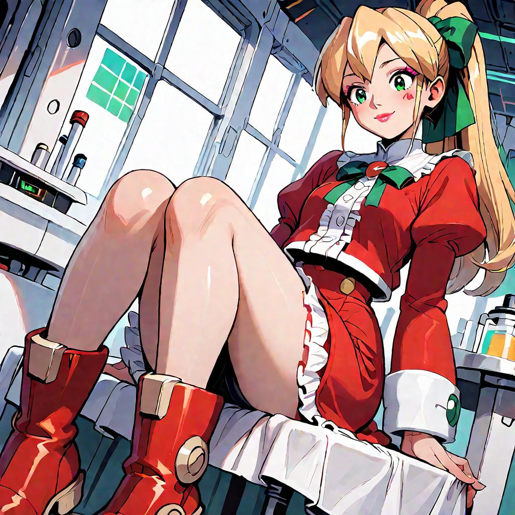 Score_9, score_8_up, score_7_up, score_6_up, score_5_up, score_4_up, source_anime, Roll (Mega man), android, long hair, blush, bangs, blonde hair, long sleeves, green eyes, hair ribbon, ponytail, sidelocks, boots, frills, red skirt, red dress, frilled dress, knee boots, red footwear, outline, green ribbon, undershirt, 1girl, solo, sitting, smile, dynamic angle, indoors, science, chair, table