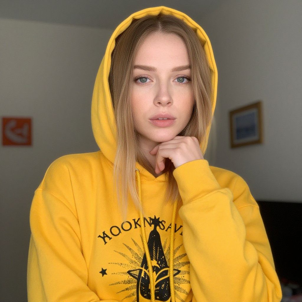 Woman, casual, yellow printed hoodie, hood up, long sleeve, natural makeup, straight blonde hair, hand on chin, blurred room background.