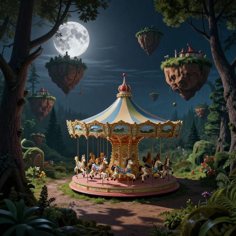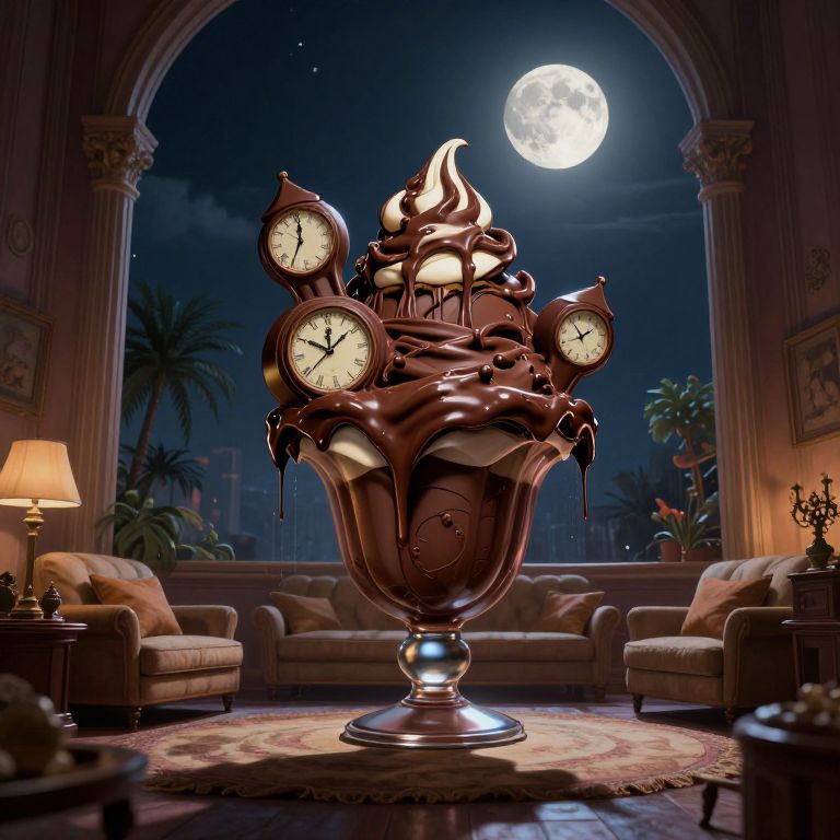 Imagine a surreal dream landscape where a colossal chocolate sundae takes center stage in an intimate living room setting. From a low-angle viewpoint, observe the sundae transform into a fantastical architectural marvel with towering clock-like structures and streams of cascading chocolate mimicking waterfalls. As day transitions to night, the sundae reflects the full moon's light, creating an otherworldly glow that stretches long shadows over the furniture below. This image blends nostalgia and whimsy, inviting viewers on a journey through their sweet recollections while exploring the enigmatic nature of time itself in a style reminiscent of Salvador Dali's melting clocks.