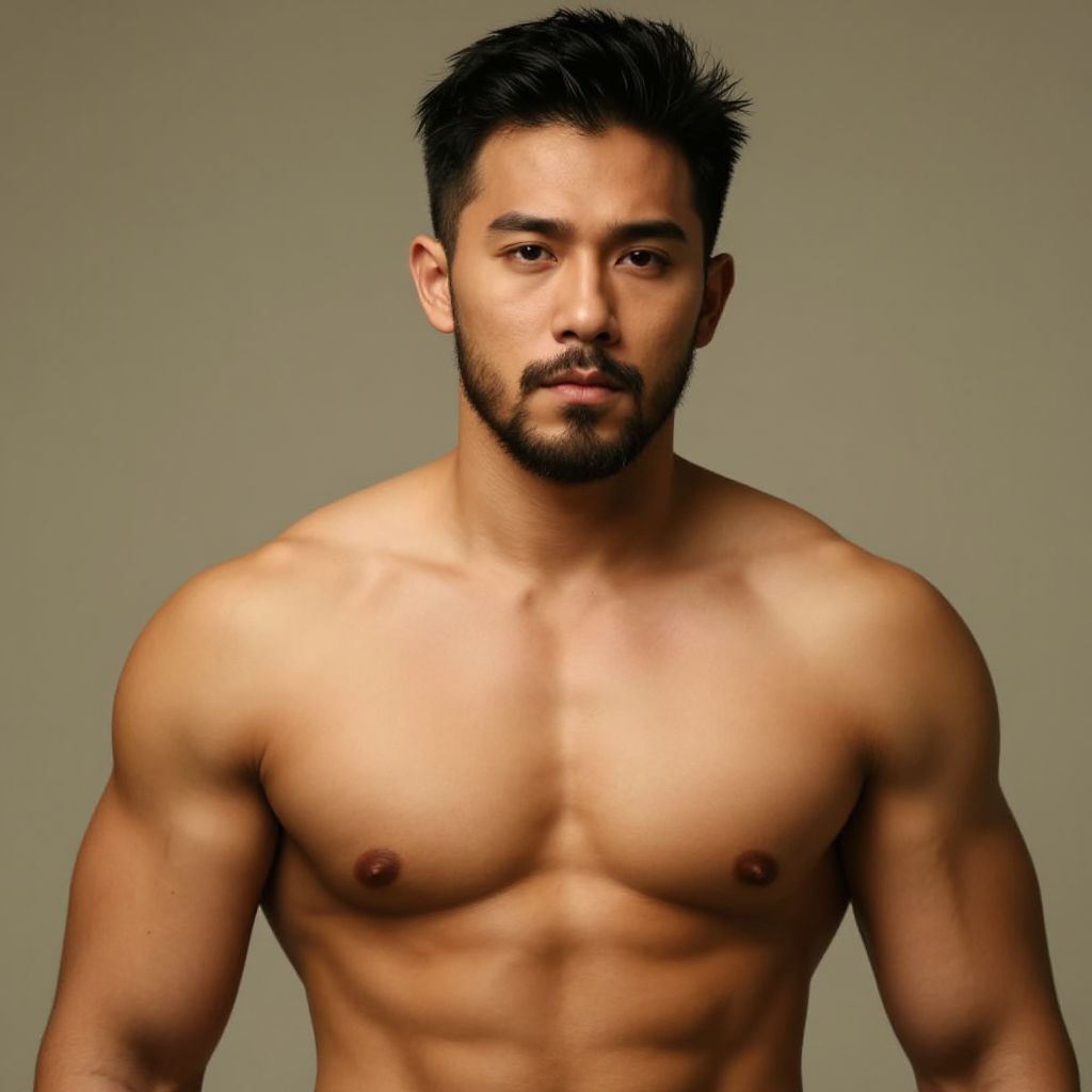 Photograph of a muscular, shirtless Asian man with short, dark hair and trimmed beard, standing against a plain gray background.