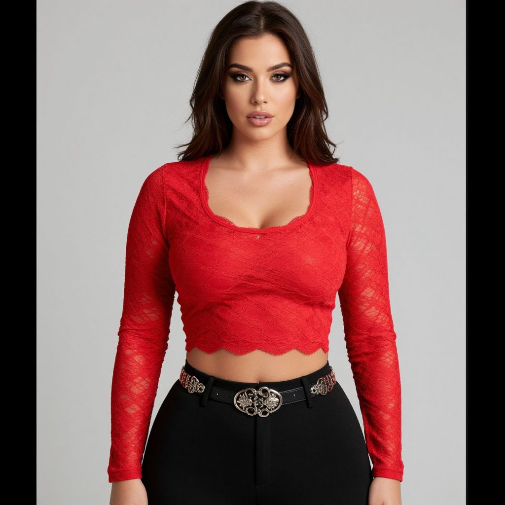 "Woman, sexy, red lace long-sleeve crop top with solid underlay, scoop neckline, black fitted high-waist pants, metallic belt with intricate detailing.. Sexy. Pretty face and beаutiful eyes. Big breasts."