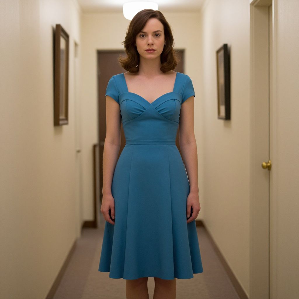 Dress Like Beth Harmon, woman in a blue dress standing in a hallway