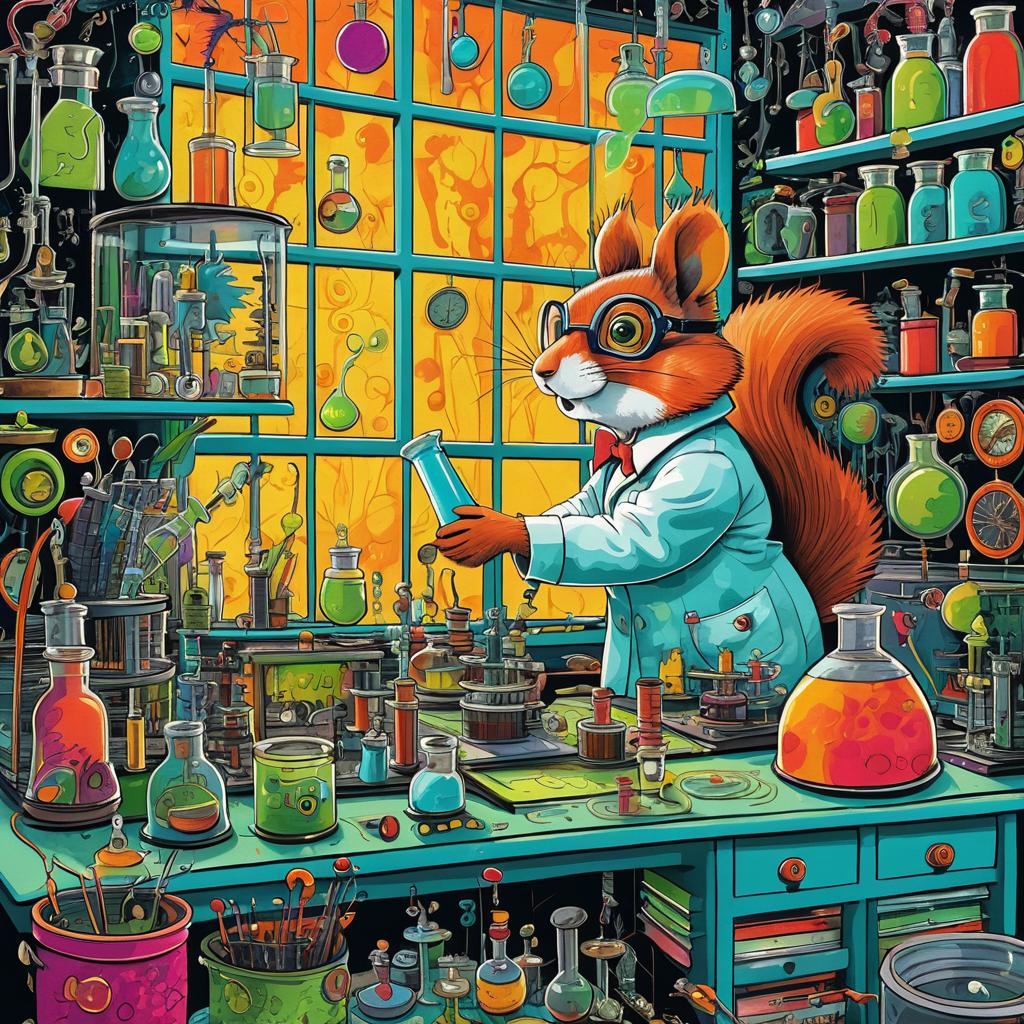 Lowbrow art of a squirrel scientist conducting experiments, influenced by Lynda Barry, set in a chaotic laboratory, humorous and detailed, rich textures, vibrant colors, playful yet slightly eerie atmosphere