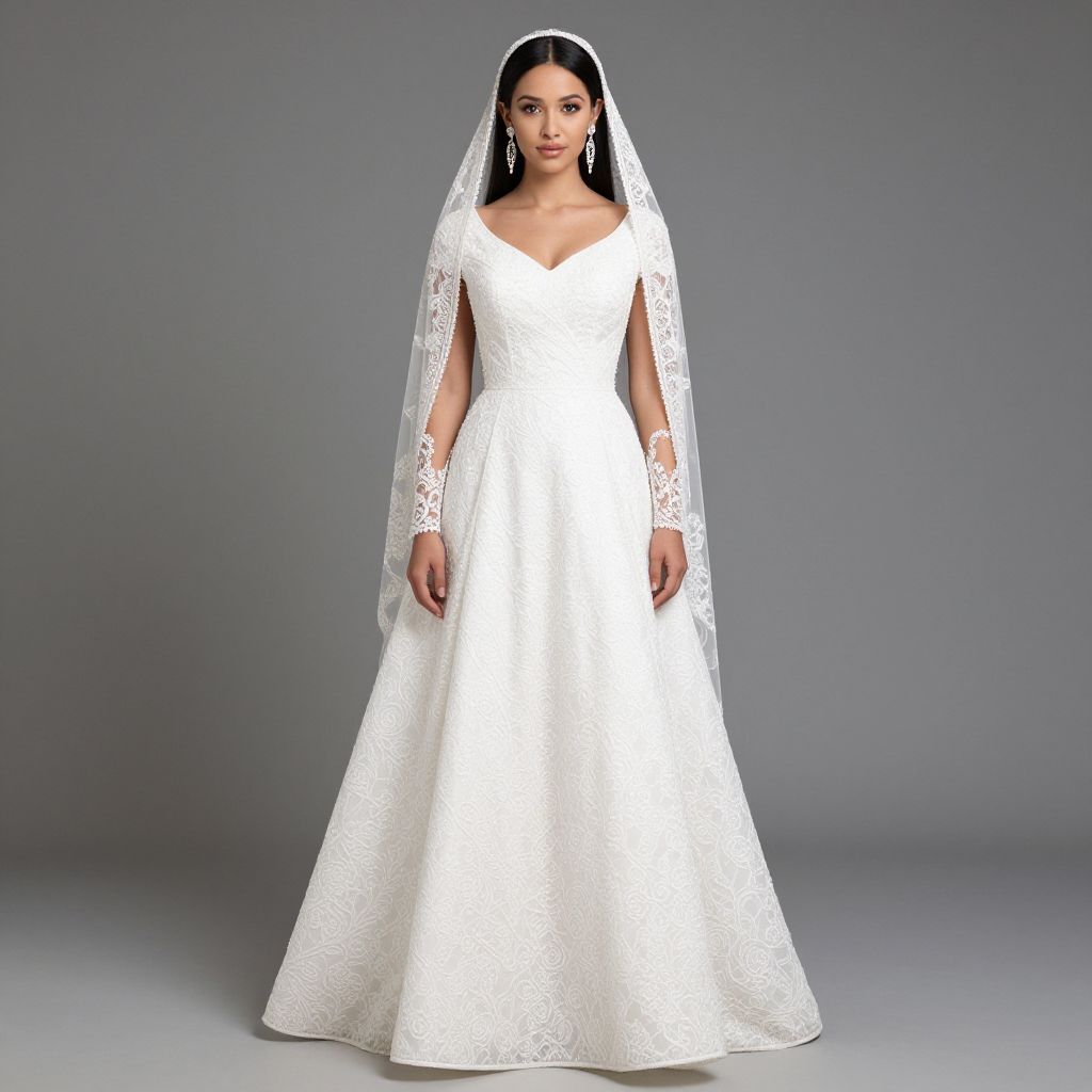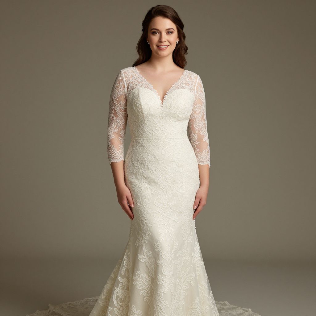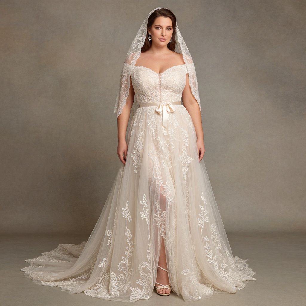 Photograph of a plus-size woman in an elegant, white, lace-trimmed wedding dress with off-shoulder sleeves and a long veil,