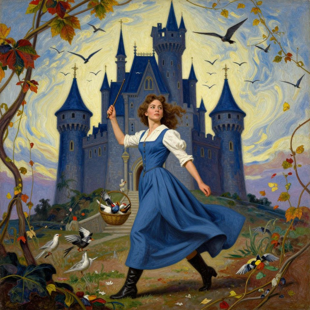 Digital painting of a curly-haired woman in a blue dress and white blouse, holding a wand, walking toward a dark castle with birds and a basket of