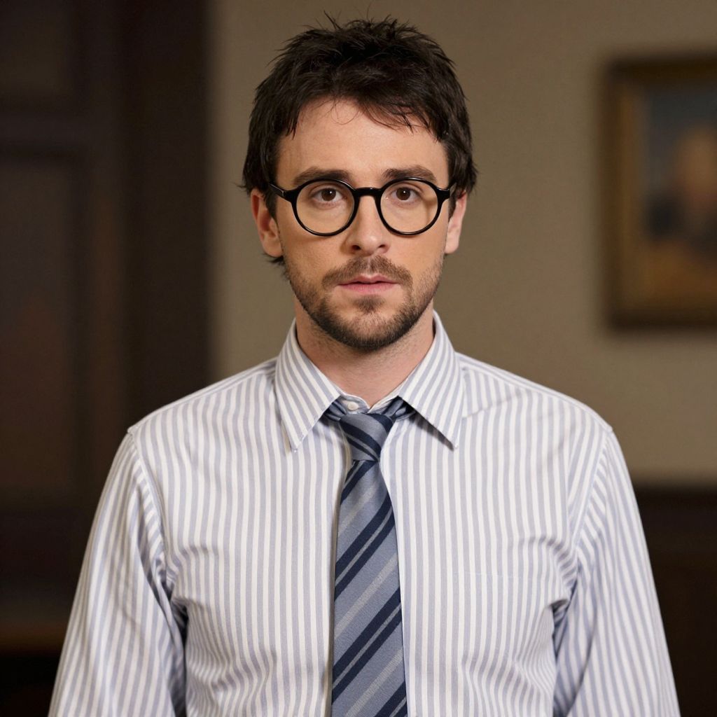 Photograph of a white man with short, dark brown hair and a beard, wearing black-rimmed glasses. He has a neutral expression and is dressed in a white, vertically striped dress shirt with a blue and gray diagonal-striped tie. The background is blurred but shows a dark wooden door on the left and a framed picture on the right. The lighting is even, highlighting his face and attire. The overall style is modern and professional.