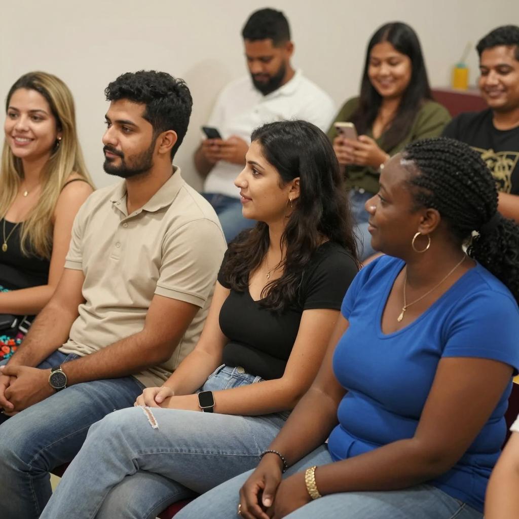 Group of seven people sitting closely together. Blonde woman in black top smiles, dark-haired man in beige polo shirt looks to the side. Dark-haired woman in black top talks to dark-skinned woman in blue top. Blonde woman in floral top looks at dark-haired man. Background shows other people, some smiling, some looking at phones. Warm, indoor setting. Casual clothing, relaxed posture.